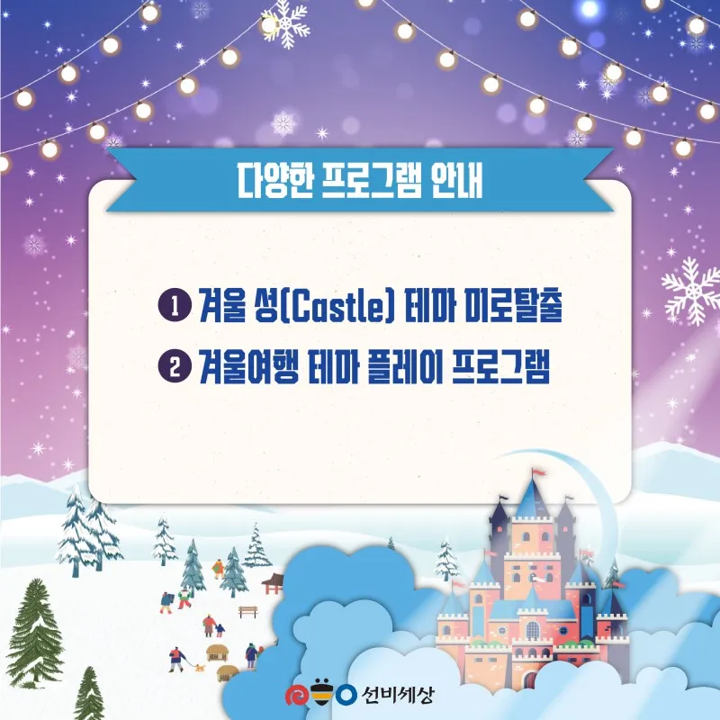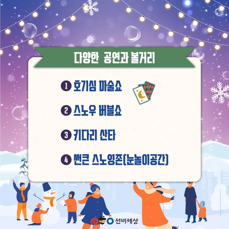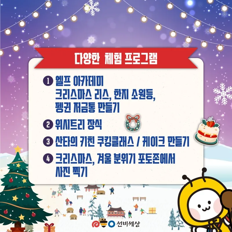 이번 윈터 페스티벌을 위해 선비세상은 전체 구역을 겨울 분위기로 새롭게 단장했습니다. 떨어지는 눈과 함께 더욱 아름다워진 선비세상에서 특별한 순간을 만나보세요.