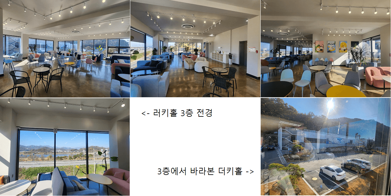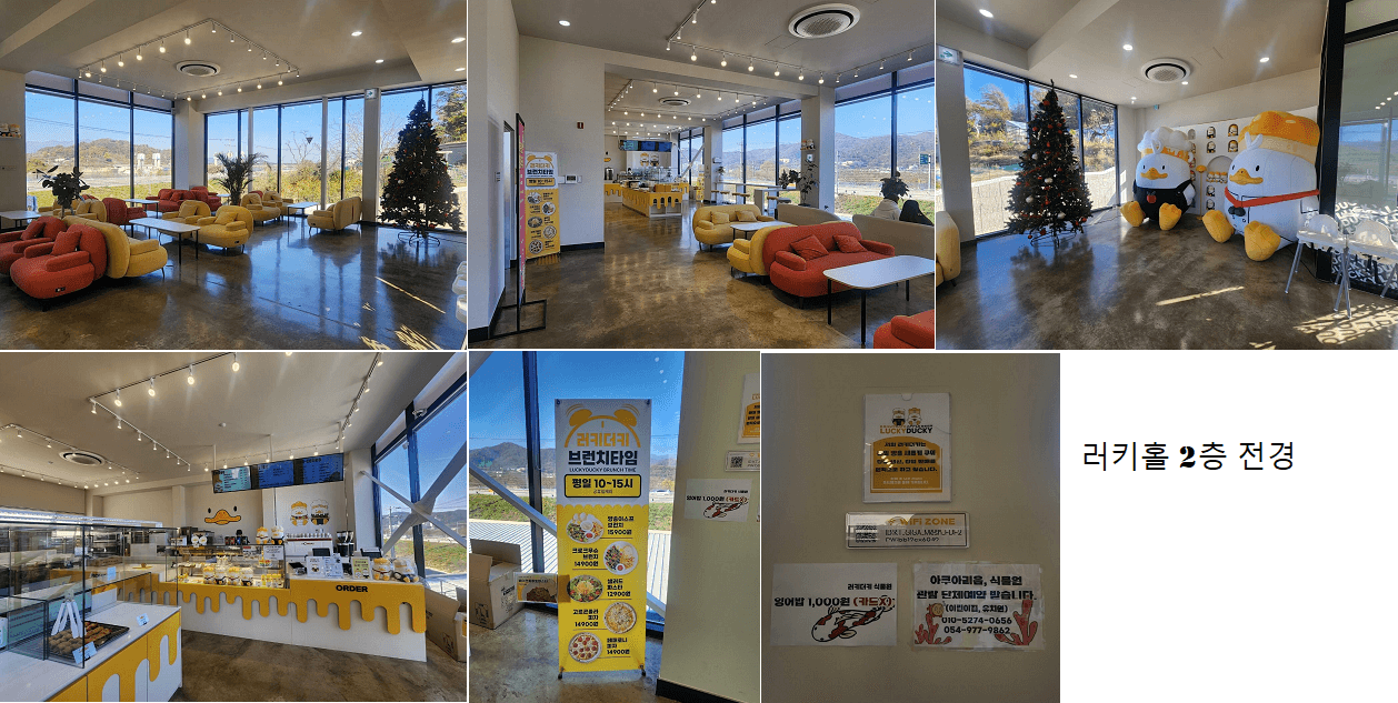 러키홀에는 1층부터 루프탑인 4층까지 이루어진 커피를 마시기에 적당한 장소입니다. 1층은 손님보다는 직원들이 사용하는 공간이며 2층부터 3층까지는 칠곡보를 경치로 즐기면서 여유로운 시간을 보내기에 좋은 장소입니다. 와이파이도 제공하고 있고 잉어밥도 판매하고 있습니다. 아쿠아리움과 식물원 관람 단체예약도 가능하다고 하니 참고해 주세요.
