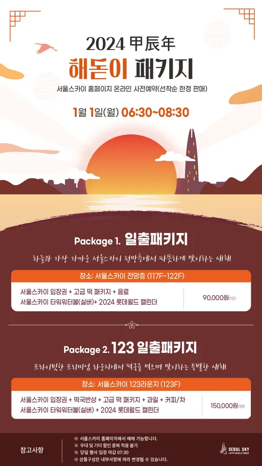 2023년 얼마 남지 않은 지금 롯데월드 서울스카이에서는 해돋이 패키지를 진행하고 있습니다. 서울스카이 전망층에서 맞이하는 새해는 그 어느 곳보다 따뜻하고 아름다울 것 같습니다. 롯데월드 서울스카이라운지에서 프라이빗하고 로맨틱하게 연말연초 함께 하시길 바랍니다.