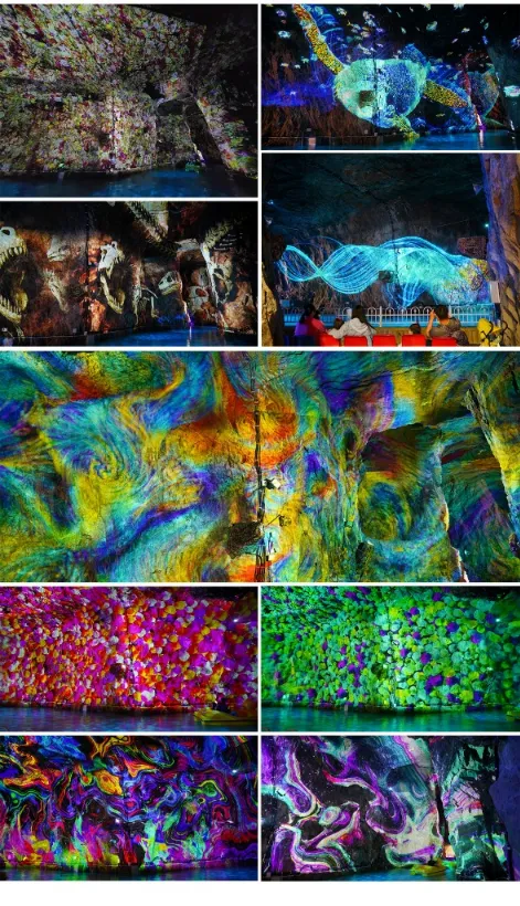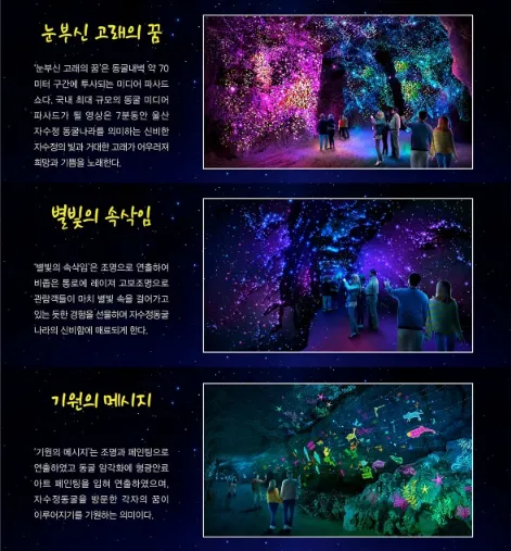 국내 최대 규모의 동굴 미디어 파사드 쇼인 '눈부신 고래의 꿈'과 '별빛의 속삭임'은 동굴내벽에 투사되는 미디어 파사드로, 울산 자수정 동굴나라의 신비한 자수정의 빛과 거대한 고래가 어우러져 희망과 기쁨을 노래합니다. 또한, '기원의 메시지'는 조명과 페인팅으로 연출된 동굴 암각화에 형광안료아트 페인팅을 입혀 연출되어 있으며, 자수정 동굴나라를 방문한 각자의 꿈이 이루어지기를 기원하는 의미를 담고 있습니다.