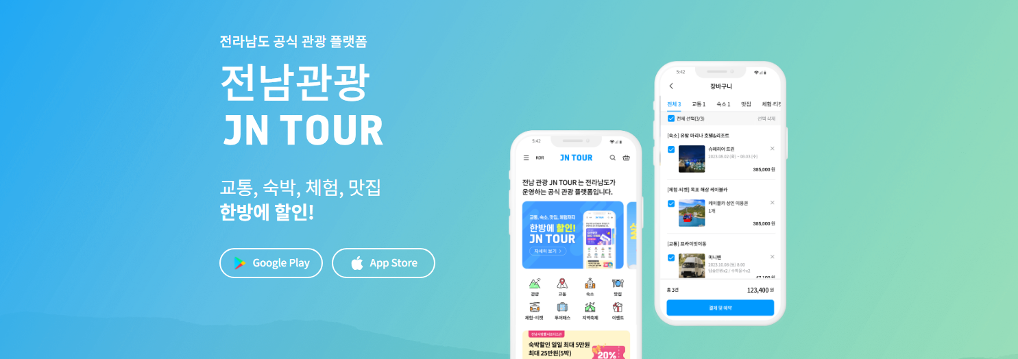 - 확실한 경비 절감 효과 : 숙박비 부담, 이제 안녕! JN TOUR 앱에서 숙소 예약하고, 최대 4만원 즉시 할인받으세요! (5박 시 최대 20만 원 할인!) 절약된 예산으로 맛있는 남도 음식 더 먹고, 예쁜 카페도 더 가고! 여행 만족도는 UP! 경비 부담은 DOWN!