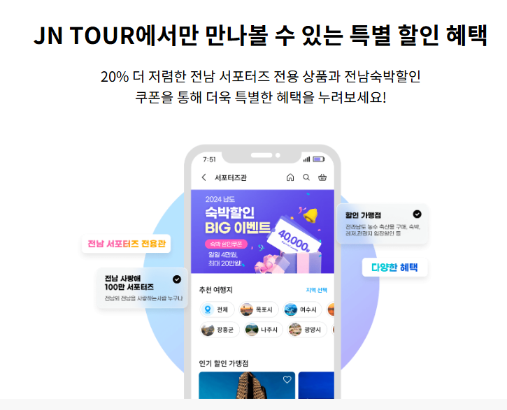2025년 전남 여행, JN TOUR 앱 할인 찬스를 놓치지 마세요! 지금 바로 JN TOUR 앱 다운로드하고, 최대 4만 원 할인 혜택 받아서 가성비 최고, 만족도 최상의 전남 여행을 완성해 보세요! 클릭 몇 번으로 똑똑하게 할인받고, 행복 가득한 전남 여행 추억을 만들어보세요! 지금 바로 JN TOUR 앱 다운로드 하러 GO! GO! GO!