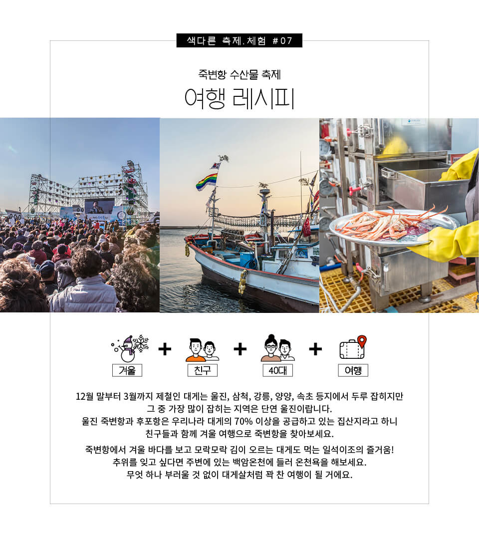 오늘은 울진의 겨울을 더욱 특별하게 만들어 줄 죽변항 수산물축제에 초대합니다. 12월 15일, 이날만의 특별한 무더위를 느끼러 울진으로 떠나보세요.