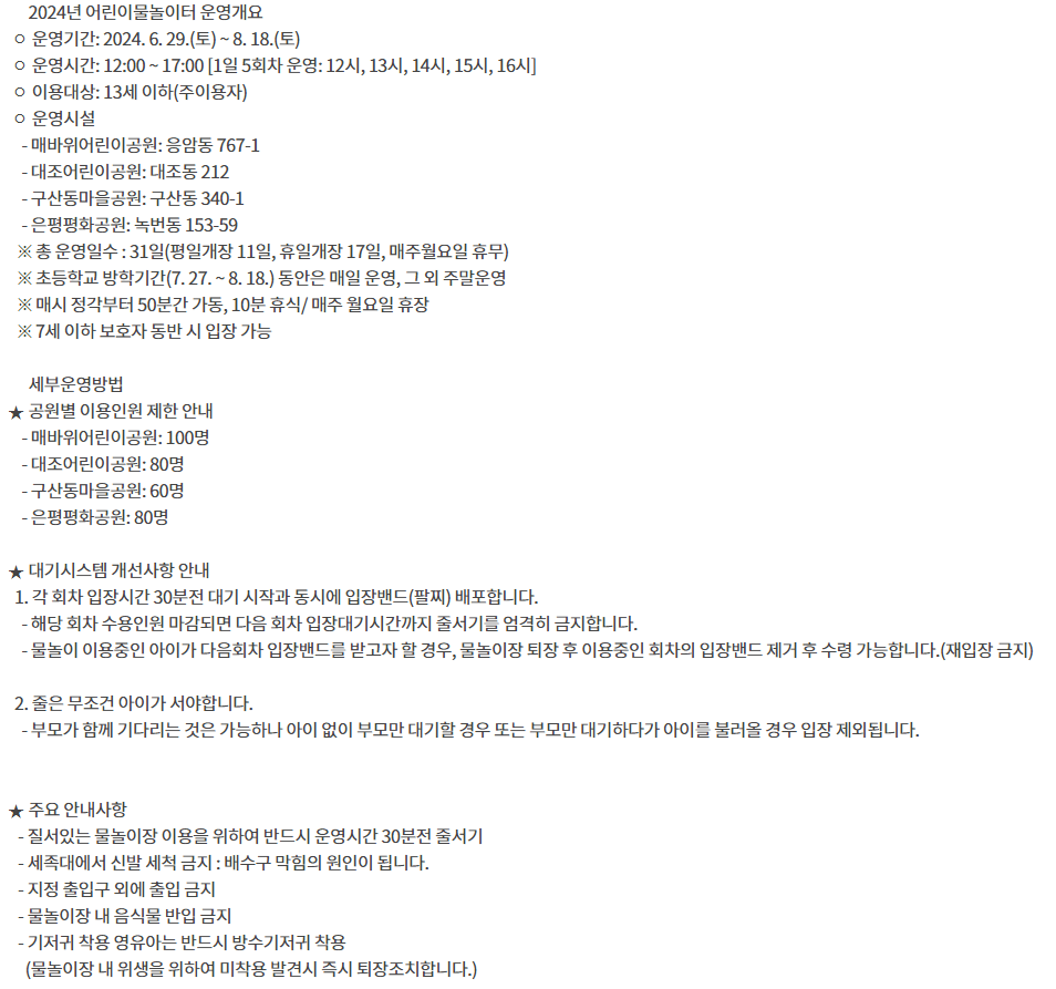 | 매바위 어린이공원 물놀이터 | 은평평화공원 물놀이터 | 대조어린이공원 물놀이터 |