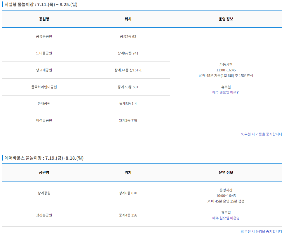 | 공릉동 근린공원 물놀이장 | 한내근린공원 물놀이장 | 각심어린이공원 물놀이장 |