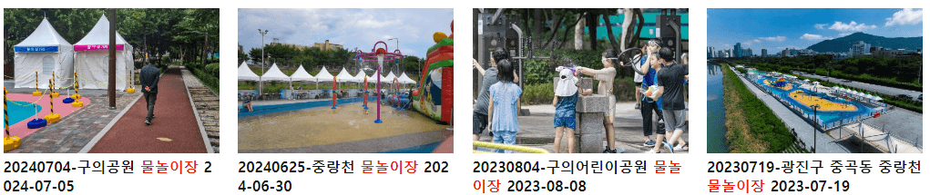 | 용허리근린공원 물놀이장 | 뒷벌어린이공원 바닥분수 | 반포종합운동장 물놀이장 |