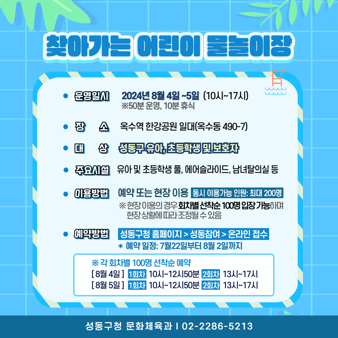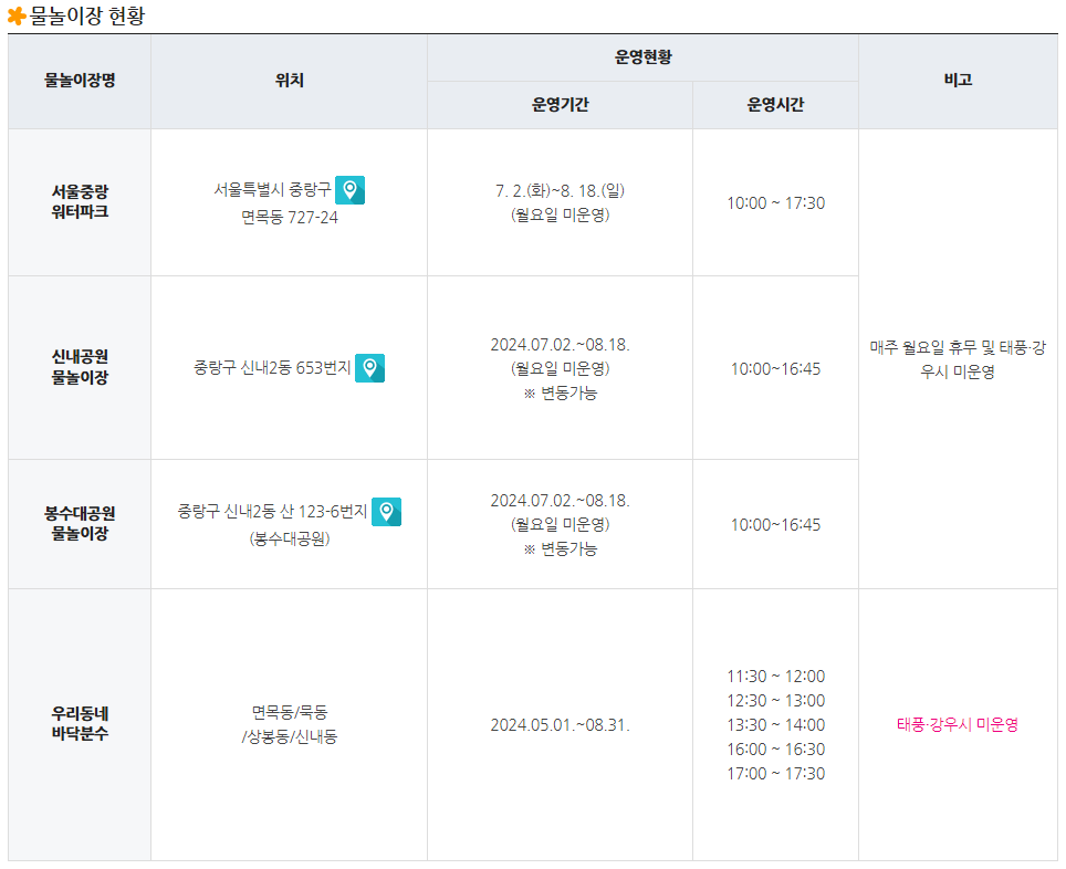 | 중곡동 중랑천 물놀이장 | 뚝섬 한강공원 수영장 | 서울어린이대공원 물놀이장 |